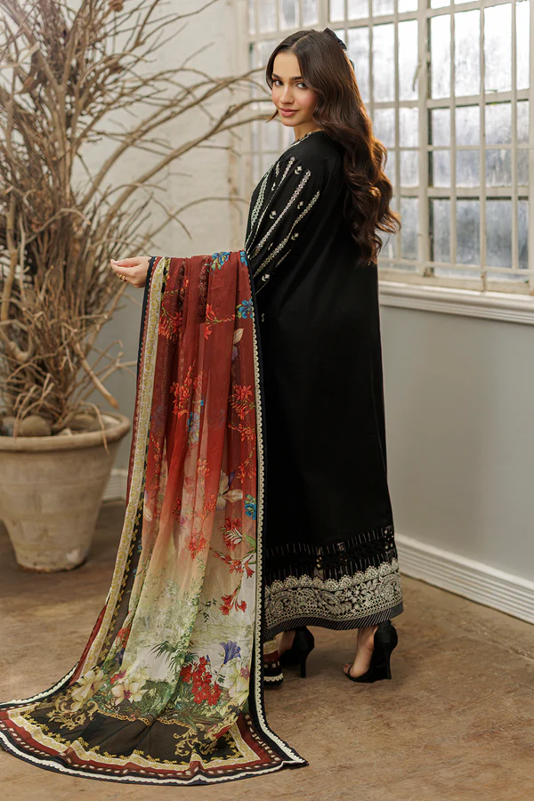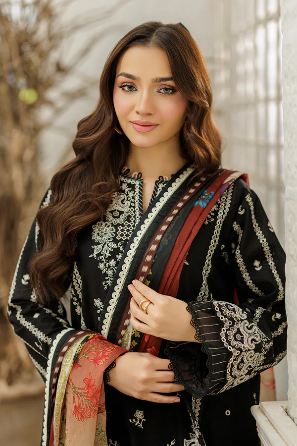 DYED EMBROIDERED COTTON SHIRT – DIGITAL PRINTED DENTING LAWN DUPATTA – DYED COTTON TROUSER