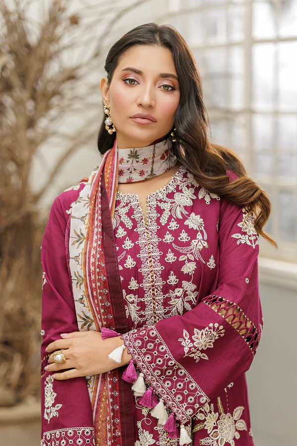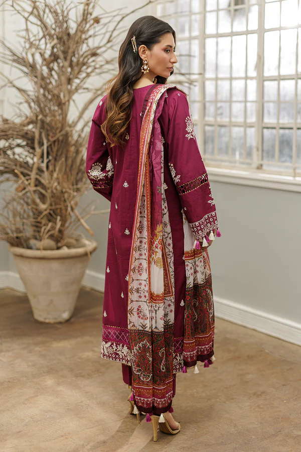 DYED EMBROIDERED COTTON SHIRT – DIGITAL PRINTED DENTING LAWN DUPATTA – DYED COTTON TROUSER
